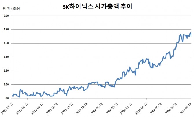 SK하이닉스의 주가는 올 들어서만 70% 넘게 뛰었다. 특히 지난달 7일 시가총액 150조원을 넘어선 이후 약 한 달만에 몸집을 19조원 이상 불리며 연일 우상향하는 흐름을 보이고 있다.