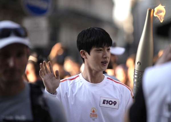 이미지 확대보기한국을 대표하는 케이팝 보이 그룹 BTS의 멤버 진이 프랑스 파리 올림픽 성화 봉송 주자로 참여했다.