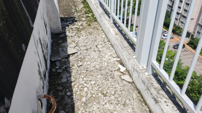 올 1월부터 제기된 민원은 해당 아파트 20개동 중 7개동 옥상 바닥 표면이 다 부서지고 가루가 돼 장마철 옥상 누수가 우려되고 있는 상황이다.