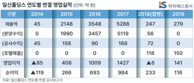 2018년 12월 일신홀딩스는 건설사업부를 인적분할해 아이에스지주에 흡수합병시켰다. 합병되기 전 3년(2015~2017년)간 일신홀딩스는 영업실적을 급성장시키며 자산도 키웠다. 2세 자녀들이 아이에스지주 지분을 많이 확보하기 위한 몸집 불리기가 아니냐는 의혹이 일어나는 대목이다.