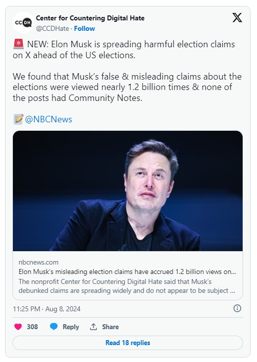 같은 맥락으로 AFP통신에 따르면 온라인 가짜뉴스 퇴치운동을 벌이고 있는 영국 시민단체 디지털혐오대응센터(CCDH)도 지난 8일 펴낸 보고서에서 “머스크 X 총수가 지난 1월부터 현재까지 올린 정치 관련 게시물을 분석한 결과 오는 11월로 예정된 미국 대선과 관련해 사실을 호도하거나 사실과 거리가 먼 것으로 밝혀진 글이 최소 50건 이상인 것으로 파악됐다”고 밝혔다.