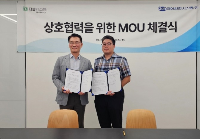 다컴시스템 윤덕로 사장(사진좌측)과 제이씨현시스템 차정헌 대표(사진 우측)가 12일 제이씨현시스템 본사에서 열린 MOU체결식에서 기념촬영을 하고 있다. 사진=다컴시스템