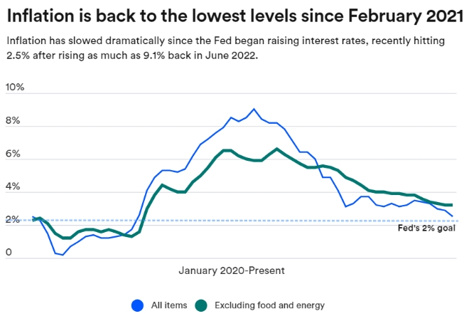 이는 전달의 상승률 2.9%보다 둔화한 수치일 뿐만 아니라 지난 2021년 2월 이후 최저 기록이다. 이에 따라 미 연방준비제도의 금리 인하 단행 시점이 가시권에 들어왔다는 전망에 더욱 힘이 실리고 있다.