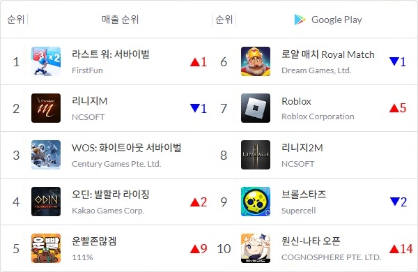 두 게임은 9월 들어 매출 투 톱을 꾸준히 유지했다. 센추리 게임즈 'WOS: 화이트아웃 서바이벌'이나 카카오게임즈 '오딘: 발할라 라이징', 릴리스게임즈의 8월 신작 'AFK: 새로운 여정' 등이 3위까지 치고 올라왔으나 2위까지 오르진 못했다.