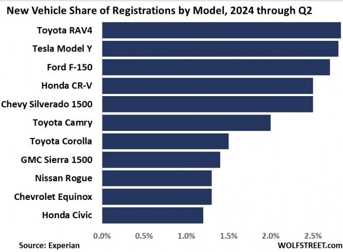 21일(현지시각) 미국 경제매체 울프스트리트닷컴은 글로벌 신용평가사 엑스피리언이 지난 상반기 미국의 신차 등록현황을 분석한 결과 포드 F-150이 토요타 라브4에 1위 자리를 빼앗긴 것으로 확인됐다.