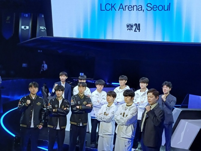 9월 26일 열린 2024 리그 오브 레전드 월드 챔피언십 출전 기념 미디어 데이 기념 사진. 왼쪽 위부터 시계 방향으로 디플러스 기아의 이재민 감독, '루시드' 최용혁·'쇼메이커' 허수 선수, T1의 '오너' 문현준·'페이커' 이상혁 선수와 김정균 감독, 젠지 e스포츠의 김정수 감독과 '캐니언' 김건부·'기인' 김기인 선수, 한화생명 e스포츠의 '도란' 최현준·'피넛' 한왕호 선수와 최인규 감독. 사진=이원용 기자