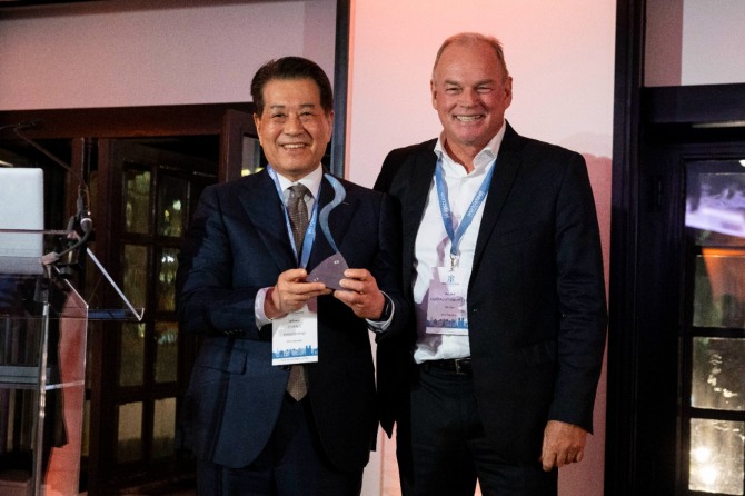 (왼쪽부터) 장인화 포스코그룹 회장, 요한피터 브라질 게르다우 부회장이 14일(현지 시각) 열린 세계철강협회 스틸리어워드 시상식에서 기념 촬영을 하고 있다. 사진=포스코이미지 확대보기