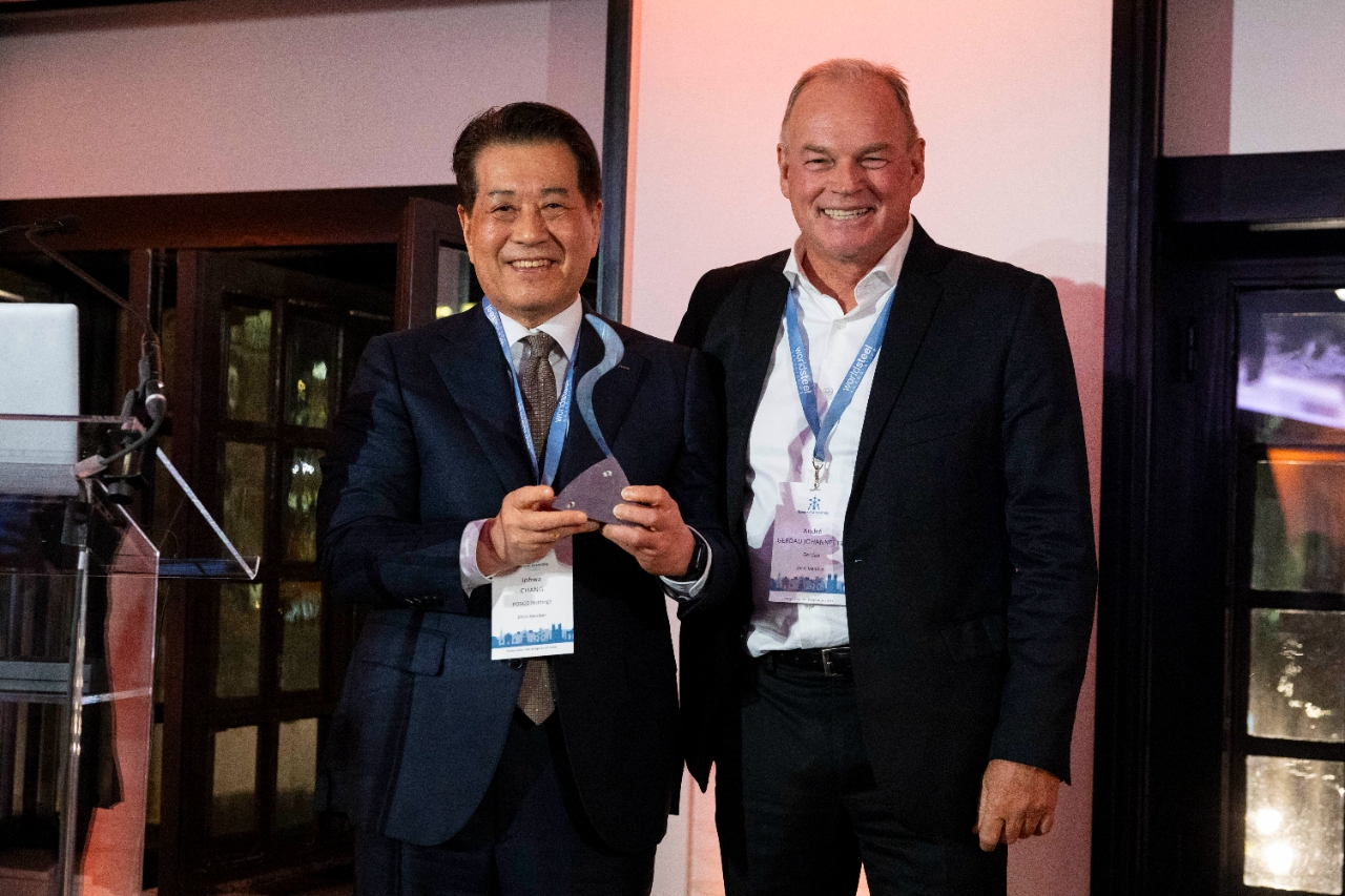 (왼쪽부터) 장인화 포스코그룹 회장, 요한피터 브라질 게르다우 부회장이 14일(현지 시각) 열린 세계철강협회 스틸리어워드 시상식에서 기념 촬영을 하고 있다. 사진=포스코
