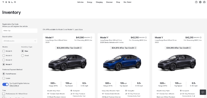 테슬라 홈페이지의 재고 현황 메뉴. 사진=테슬라