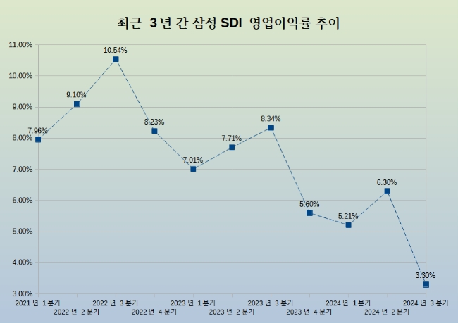 이미지 확대보기삼성SDI는 3분기 매출 3조9356억원, 영업이익 1299억원을 실현했다고 30일 밝혔다. 1년 전과 비교해 매출은 29.8%, 영업이익은 72.1% 줄었다. 순이익은 2304억원으로 63% 줄었다. 직전 분기와 비교해서는 실적이 악화했다. 매출은 3.7%, 영업이익은 46.1%, 순이익은 23.5% 각각 줄었다.