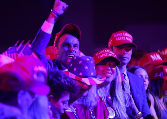 공화당 대선 후보이자 전 미국 대통령인 도널드 트럼프를 지지하는 한 사람이 5일(현지시각) 미국 플로리다주 웨스트 팜 비치의 팜 비치 카운티 컨벤션 센터에서 열린 트럼프의 선거 밤 집회 현장에서 기뻐하고 있다. 사진=로이터