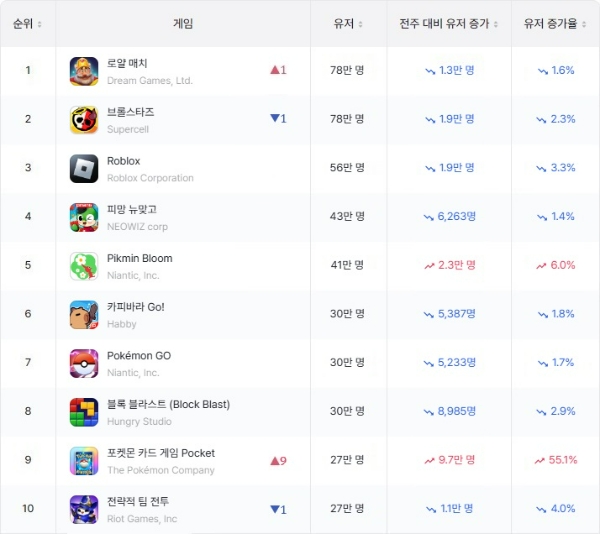 국내 WAU 톱10을 살펴보면 또 다른 포켓몬 IP 게임인 '포켓몬 고'가 7위, 같은 개발사인 나이언틱이 닌텐도 IP를 활용해 개발한 '피크민 블룸'이 5위에 자리 잡았다. 세 게임의 WAU를 합하면 약 98만명으로 WAU 투 톱 '로얄 매치', '브롤스타즈'를 훌쩍 넘긴다.