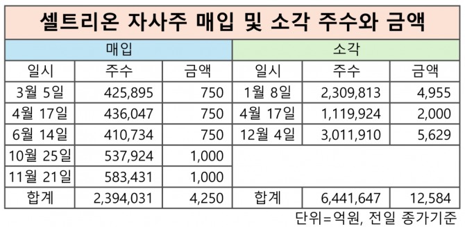 이미지 확대보기8일 바이오 업계에 따르면 지난해 셀트리온은 574만2688주(약 1조2500억 원 규모)를 매입했고 이 가운데 230만9813주를 소각했다. 주식을 매입과 소각한 시점은 셀트레온헬스케어와 합병되기 전이었다.