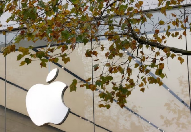 애플스토어 입구에 있는 애플 로고. 사진=로이터