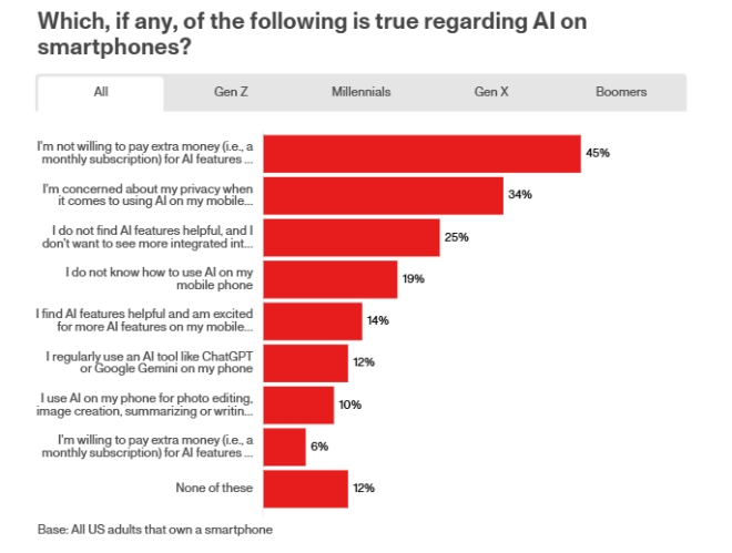 응답자의 45%는 AI 기능 사용을 위한 구독료 부과에도 반대한다는 입장을 밝혔고 34%는 AI 기능이 탑재되면 사생활 침해 가능성이 있다고 우려했다.