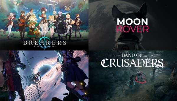 왼쪽 위부터 시계 방향으로 빅게임스튜디오 '브레이커스: 언락 더 월드', 문 로버 게임즈 로고, 버추얼 알케미 '밴드 오브 크루세이더', 미스틸게임즈 '타임 테이커즈' 이미지. 사진=각 사