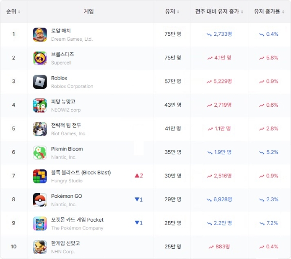 헝그리 스튜디오의 퍼즐 게임 '블록 블라스트'가 10월 초 이후 2주 만에 7위 자리에 다시 올랐다. 11위는 111%의 '운빨존많겜(22만4432명, 이하 구글 플레이스토어 12월 2주차 WAU)'이었으며 하비 '궁수의 전설2(20만5042명)', 슈퍼셀 '클래시 로얄(19만8242명)' 등이 그 뒤를 따랐다.