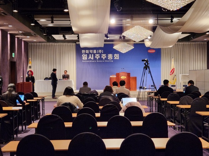 이미지 확대보기19일 한미약품은 서울시 송파구에 위치한 서울교통회관헤서 임시주총을 진행했다. 이날 안건으로는 박재현 한미약품 대표이사와 신동국 기타비상무이사를 해임하는 안건과 박준석 한미사이언스 부사장과 장영길 한미정밀화학 대표이사를 사내이사로 선임하는 안건이 진행됐다.