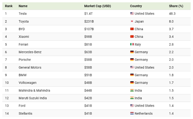 테슬라에 이어 전세계 시총 2위를 기록한 업체는 판매량 기준으로 독일의 폭스바겐과 1위 자리를 놓고 각축을 벌이고 있는 일본의 토요타자동차인 것으로 나타났으나 테슬라와 격차는 매우 컸다.