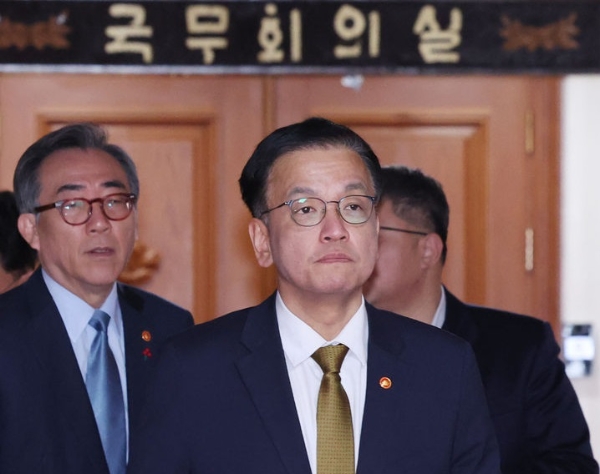 한덕수 국무총리 탄핵 소추로 대통령 권한대행을 맡게된 최상목 국무부총리 겸 기획재정부 장관이 27일 임시 국무의원 간담회 주재를 위해 회의실에 입장하고 있다. 왼쪽은 조태열 외교부 장관. 사진=뉴시스