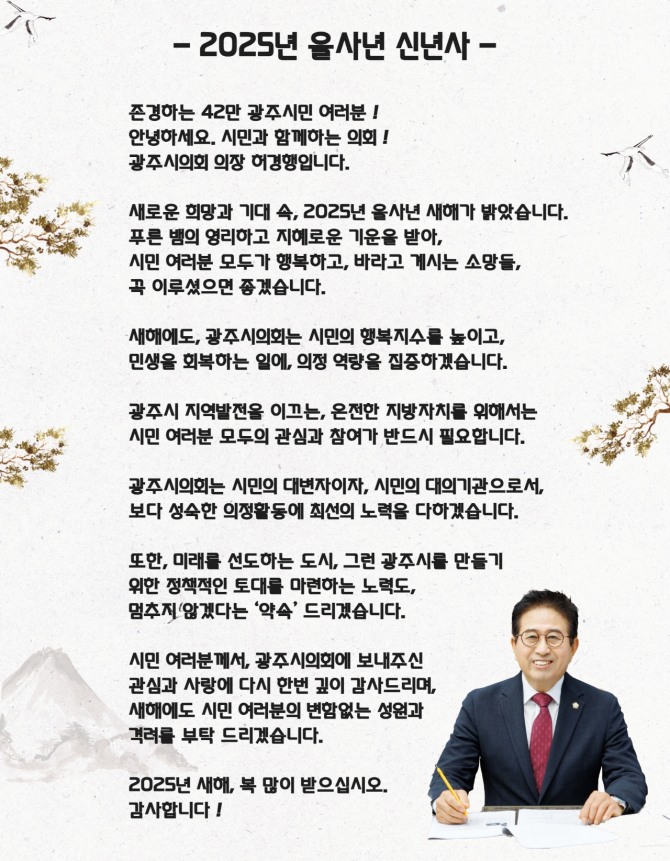 이미지 확대보기1일 신년사에서 허 의장은 "광주시 발전을 이끄는 온전한 지방자치를 위해서는 시민 여러분 모두의 관심과 참여가 반드시 필요하다"며 "시의회는 시민의 대변자이자, 시민의 대의기관으로서 보다 성숙한 의정 활동에 최선을 다하겠다"고 말했다.