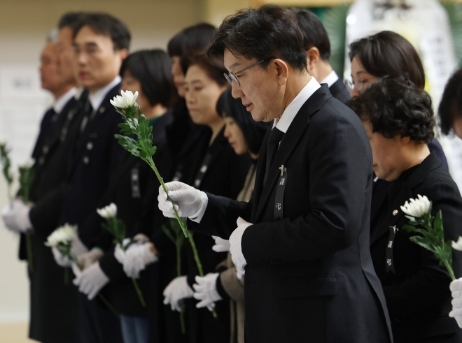 국민의힘 권성동 원내대표와 의원들이 1일 전남 무안군 무안종합스포츠파크에 마련된 제주항공 참사 합동분향소를 찾아 조문하고 있다. 사진=연합이미지 확대보기
