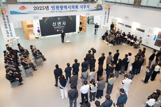 이미지 확대보기인천시의회는 지난 3일 의회 중앙홀에서 의원, 사무처 직원 등 100여 명이 참석한 가운데 ‘2025년 시무식’을 열었다. 올해 시무식은 전남 무안공항 여객기 참사를 애도하며 차분한 마음가짐으로 진행됐다.