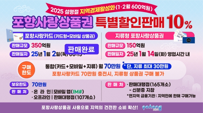 한편 포항시는 내달 3일에도 포항사랑카드 100억원을 추가 발행해 10% 특별할인 판매를 진행할 계획이다. 2월 개인 구매 한도는 50만원이며 보유 한도는 70만원으로 유지된다.