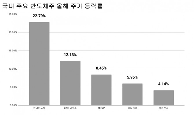 같은기간 HBM(고대역폭메모리)과 반도체 장비 관련주인 SK하이닉스(12.13%), HPSP(8.45%), 리노공업(5.95%), 삼성전자(4.14%) 등도 동반 상승했다.