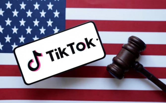 글로벌 숏폼 비디오 플랫폼인 '틱톡' 로고, 미국 국기인 성조기와 판사 의사봉.미국 대법원이 중국 바이트댄스에 틱톡 매각을 강제하는 법안의 변론을 진행했다. 사진=로이터