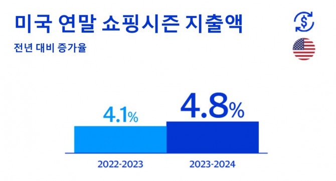 이미지 확대보기이번 보고서는 연말 최대 쇼핑 시즌인 블랙 프라이데이(11월 네 번째 금요일)와 사이버 먼데이(추수감사절 다음 주 월요일)를 포함한 11월 1일부터 7주간의 미국 소매 판매 데이터를 기반으로, 비자 결제 네트워크 데이터와 설문 조사를 통해 추정한 기타 결제 수단 데이터가 반영됐다. 현금과 수표를 포함한 모든 결제 방식을 포괄하는 데이터로, 물가 상승률은 반영하지 않은 수치다.
