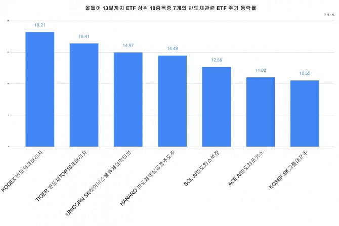 이미지 확대보기한국거래소에 따르면 올 들어 13일까지 수익률 상위 10개 ETF 중 7개가 국내 반도체 종목 관련 ETF였다.