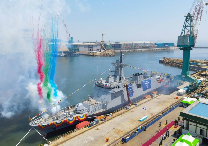 HD현대중공업 울산 본사에서 진수된 3200톤급 필리핀 초계함 1번함 '미겔 말바르(Miguel Malvar)함'의 모습. 사진=HD현대