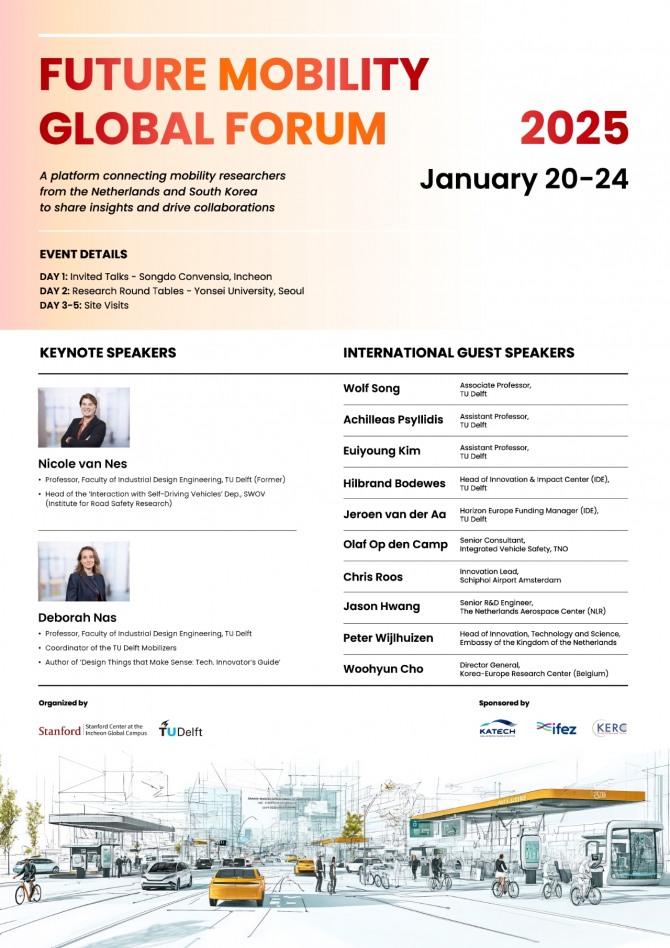 이번 포럼은 ‘모빌리티가 도시와 사회에 미치는 영향’을 주제로 전문가들이 발표와 논의를 진행한다. 특히 한국과 네덜란드 간 연구 협력 확대와 지속 가능한 스마트 도시 설계, 최신 모빌리티 기술의 활용 가능성을 심도 있게 다룰 예정이라고 주최 측은 밝혔다.