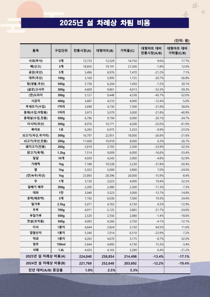 이미지 확대보기서울시농수산식품공사(사장 문영표, 이하 공사)는 서울시 내 대형마트, 전통시장, 가락시장(가락몰) 총 25곳을 대상으로 ‘설 차례상 차림 비용(이하 구매비용)’ 을 조사한 결과 이같이 발표했다.