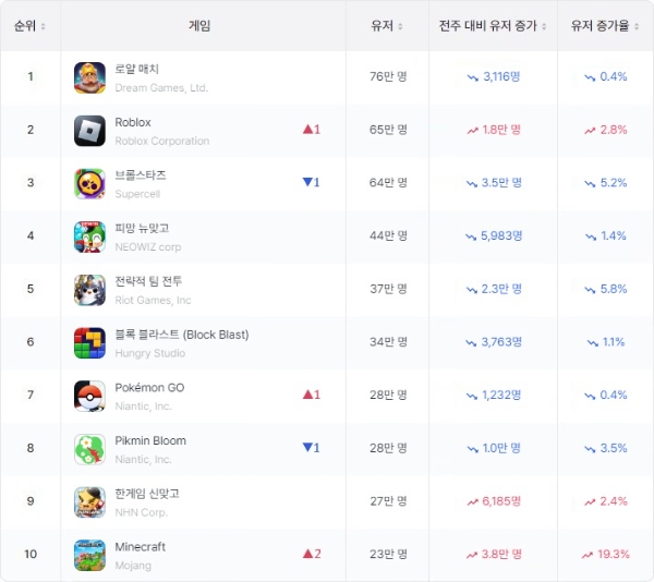 로블록스가 브롤스타즈를 제치고 WAU 2위에 올랐다. 2024년 2월 이후 약 1년 만에 3위보다 높은 순위에 올라섰다. 이 외에도 나이언틱의 '포켓몬 고'가 같은 개발사의 '피크민 블룸'을 제치고 7위에 자리 잡았다.