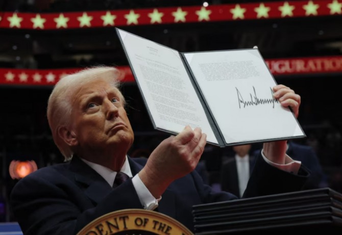 도널드 트럼프 미국 대통령이 2025년 1월 20일(현지시각) 미국 워싱턴에서 열린 두 번째 대통령 취임식 날 캐피털 원 아레나에서 열린 취임식 퍼레이드에서 행정명령을 발표하고 있다. 사진=로이터