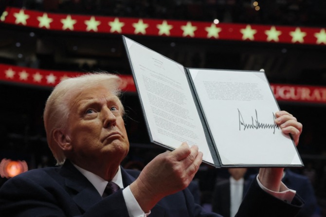도널드 트럼프 미국 대통령이 20일(현지시각) 미국 워싱턴 DC에 위치한 '캐피털 원 아레나'에서 진행된 대통령 취임식에서 행정명령서를 관중에게 들어보이고 있다. 사진=로이터/뉴스1이미지 확대보기