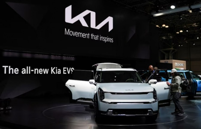 기아 EV9이 2023년 4월 5일 미국 미국 맨해튼에서 열리는 뉴욕 국제 오토쇼에 전시되어 있다. 사진=로이터
