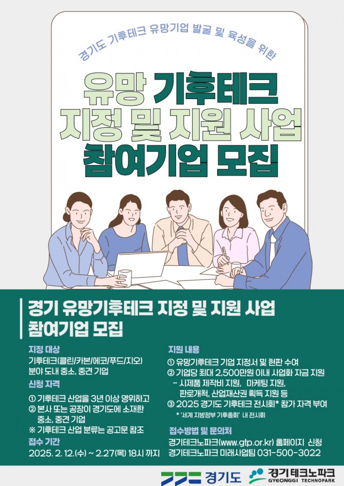 경기테크노파크가 도내 기후테크 선도기업을 발굴하고 집중적으로 지원하기 위해‘2025년 경기도 유망기후테크 지정 및 지원사업' 참여기업을 2월 27일까지 모집한다. 포스터=경기테크노파크