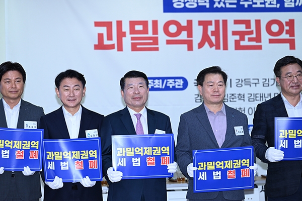 지난해 7월 백경현 구리시장(가운데)이 과밀억제권역 국회 토론회에 참석하고 있는 모습. 사진=구리이미지 확대보기