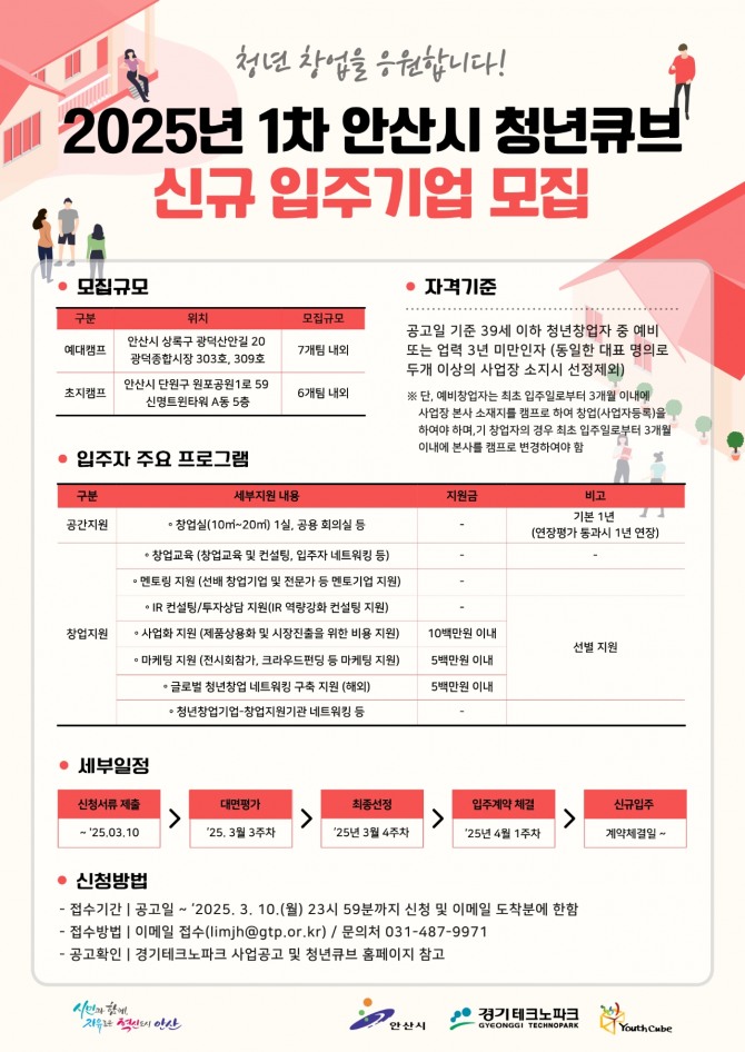 이미지 확대보기모집 대상은 39세 이하 청년창업자 중 예비 또는 업력 3년 미만인 기업이며, 입주 기간은 최대 2년까지 가능하다. 선정된 기업은 2025년 4월 중 입주할 예정이며 최초 입주일로부터 3개월 이내 본사 소재지를 입주한 캠프로 변경해야 한다.