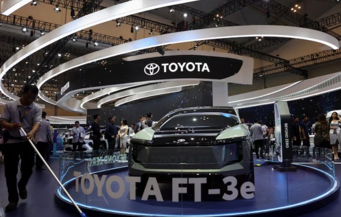 2024년 7월 18일 인도네시아 탕에랑에서 열린 인도네시아 국제 오토쇼에서 한 남자가 토요타 FT-3e 근처 바닥을 닦고 있다. 사진=로이터