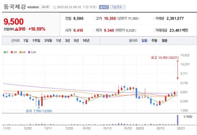 이미지 확대보기21일 한국거래소에 따르면 오전 9시 32분 현재 유가증권시장에서 동국제강은 전 거래일보다 10.59% 오른 9500원에 거래 중이다. 현대제철 5.48%, POSCO홀딩스 4.28%를 포함한 국내 후판 3사의 주가가 모두 상승하고 있다.