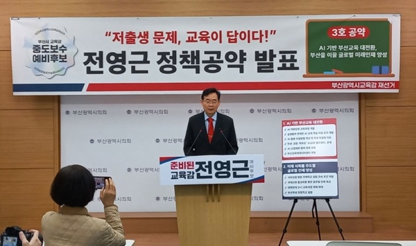 21일 전영근 예비후보 측에 따르면 전날 부산시의회 브리핑룸에서 발표한 3호 공약은 부산교육의 경쟁력을 높이고 저출생 문제와 인구 유출 문제를 해결하기 위해 ‘AI 교육’과 ‘글로벌 교육’을 핵심 축으로 삼겠다는 내용이다.