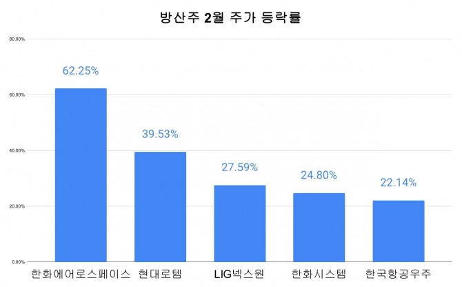 이미지 확대보기27일 한국거래소에 따르면 한화에어로스페이스는 2월 들어 이날까지 62.25% 올라 64만9000원에 거래를 마감했다. 시가총액은 18조2324억원에서 29조5821억원으로 불어났다. 같은 기간 현대로템(39.53%), LIG넥스원(27.59%), 한화시스템(24.80%), 한국항공우주(22.14%) 등 방산주 관련 종목은 일제히 크게 상승했다.