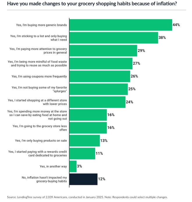 미국 소비자들은 가격 부담을 줄이기 위해 다양한 전략을 활용하고 있는 것으로 나타났다. 이번 조사에 참여한 소비자의 44%는 브랜드 제품 대신 일반 브랜드를 선택하고 있으며, 38%는 미리 계획한 품목만 구매한다고 답했다.