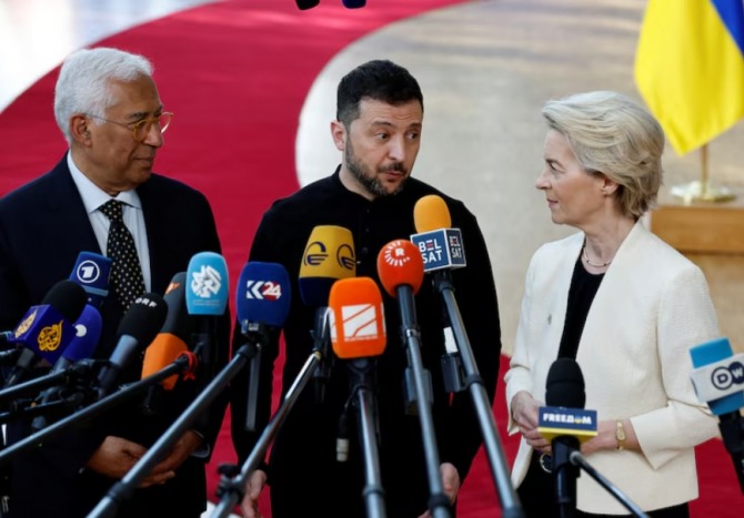 볼로디미르 젤렌스키 우크라이나 대통령, 안토니오 코스타 유럽연합 이사회 의장, 우르줄라 폰데어라이엔 유럽연합 집행위원장이 2025년 3월 6일 벨기에 브뤼셀에서 우크라이나와 유럽 방위에 대해 논의하기 위한 유럽연합 지도자 특별 정상회담에 참석하면서 언론에 연설하고 있다. 사진=로이터