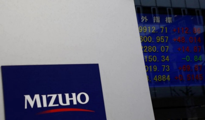 일본 도쿄 한 미즈호 증권사 객장의 놓인 미즈호 금융그룹의 로고. 사진=로이터이미지 확대보기