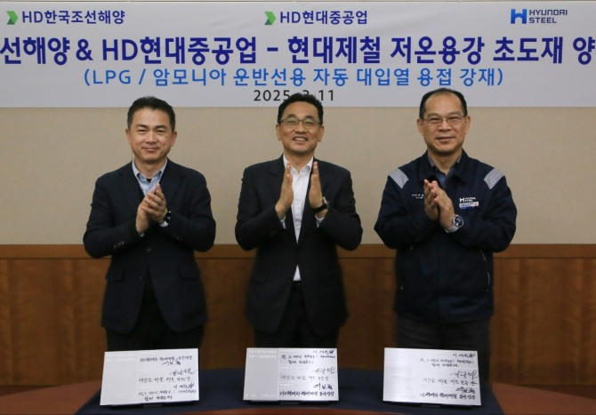 이미지 확대보기현대제철은 11일 충남 당진제철소에서 HD한국조선해양, HD현대중공업 관계자들과 함께 액화석유가스(LPG)‧암모니아 운반선용 신규 후판 강재 초도 생산 기념식을 가졌다. 이번에 초도 생산한 신규 개발 후판은 극저온에서 외부 충격에 버티는 능력을 극대화하고 용접성을 향상시킨 것이 특징이다.